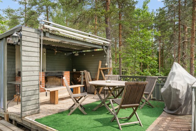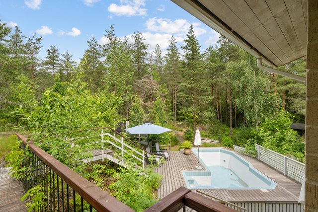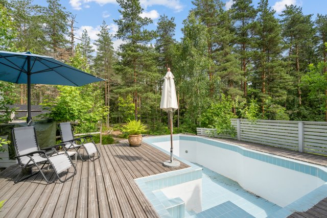 Suojaisalta pihalta löytyvät uima-allas, erillinen perinteinen puusauna, kesäkeittiö sekä lämmin autotalli autokatoksella. Täydellinen kokonaisuus omassa rauhassa, mutta silti vain noin 20 minuutin matkan päässä Itäkeskuksesta ja lentokentältä.