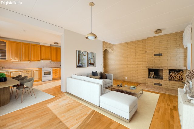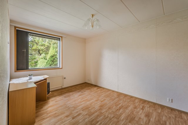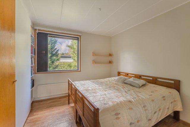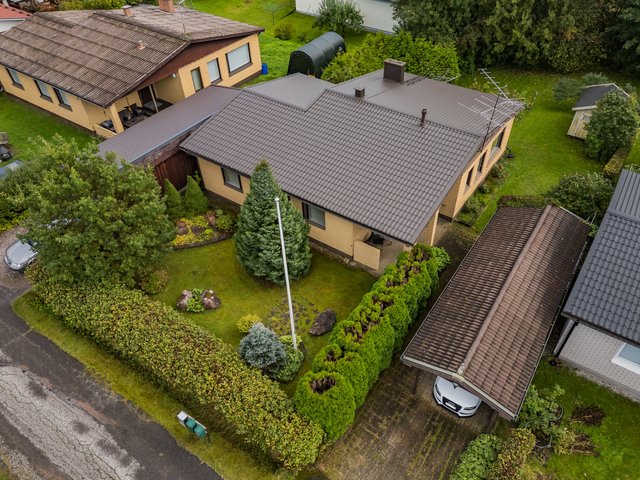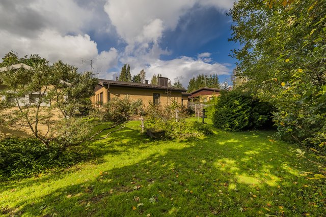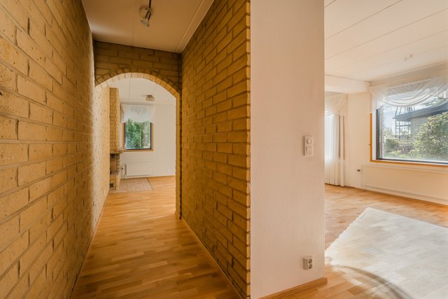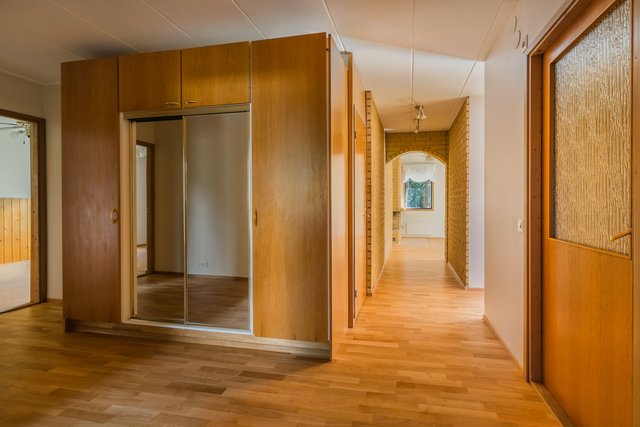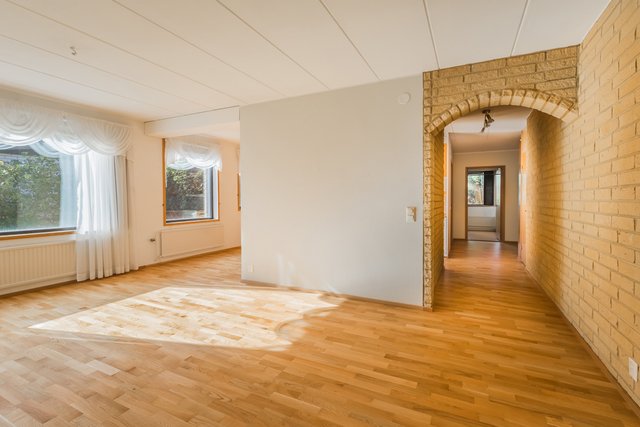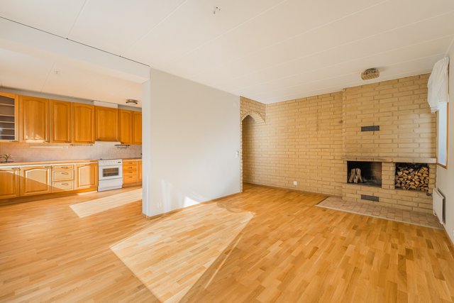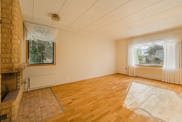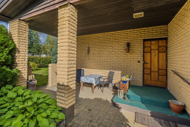 Kolme makuuhuonetta ja yksi bonushuone omalla sisäänkäynnillä, tilava sisääntulo, valoisa keittiön, ruokailutilan ja olohuoneen yhdistelmä ja komea aikakaudelle tyypillinen avotakka - tänne mahtuu isompikin perhe kotoilemaan. Eikä autoakaan ole unohdettu - sille löytyy katospaikka varaston kyljestä.