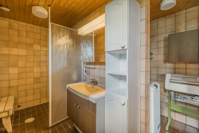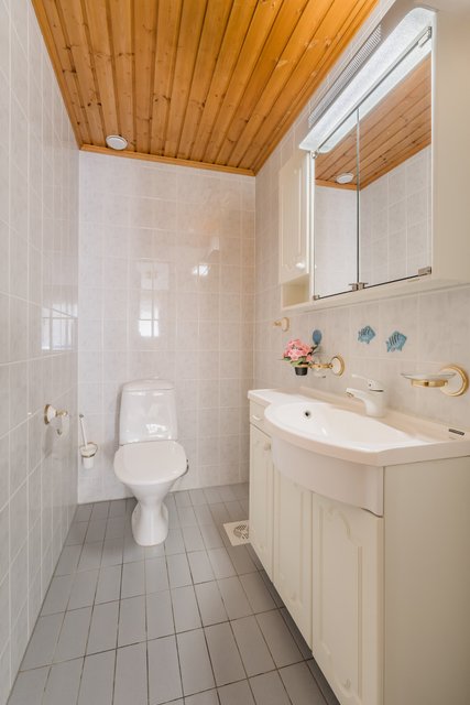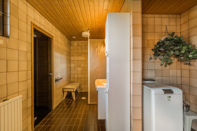 Pesutilat ovat alkuperäiset, mutta rakennustapansa vuoksi eipä tässä mikään maailman hätä vielä ole - toki on se remontti viisasta tehdä, jotta talon elinkaari jatkuu edelleen hyvänä. Toiselle vessalle on varaus, samoin kuin puulämmitteiselle kiukaalle. Öljylämmitys on vaihdettavissa ilma-vesilämpöpumppuun, jos se tuntuu mukavammalta vaihtoehdolta. Nämä seikat on huomioitu myyntihinnassa.