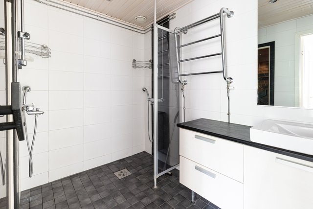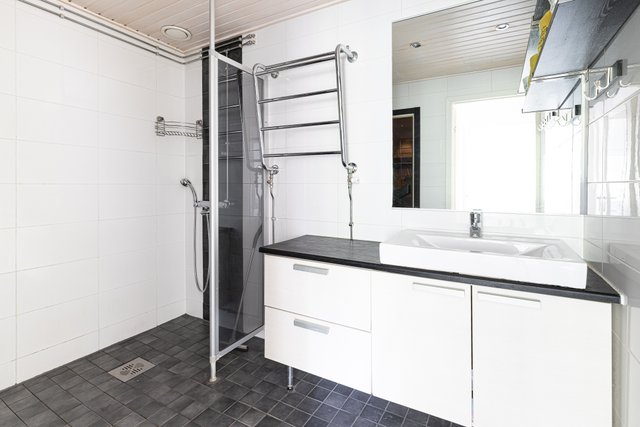 - Suihku (x2), lattialämmitys, allaskaappi, pesuallas, ja peili