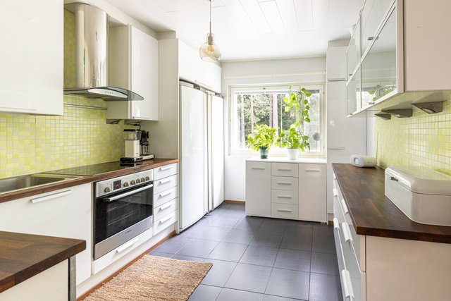 - Jääkaappi (AEG), erillinen pakastin (AEG), astianpesukone (Bosch), liesituuletin (Hormiin), erillisuuni (Bosch), ja liesi (keraaminen bosch)