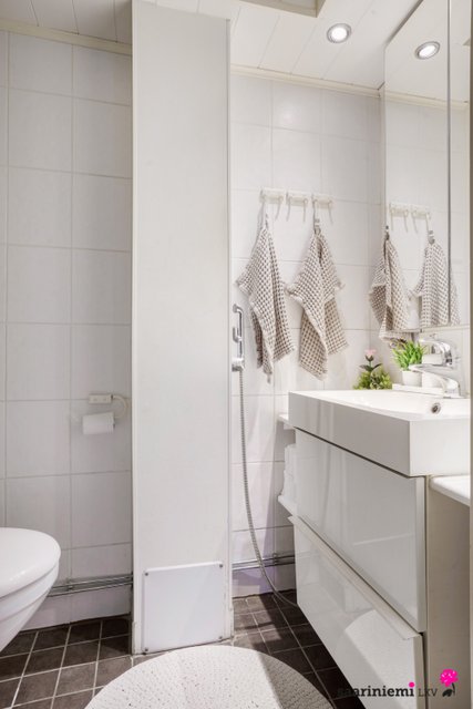 - Suihku, suihkuseinä, lattialämmitys, peili, wc-istuin, pesukoneliitäntä, pöytätaso, lattiakaivo, pyyhekuivain/seinäpatteri sekä tila kuivausrummulle, ja pesuallas