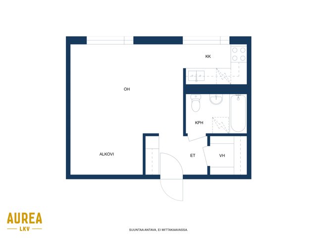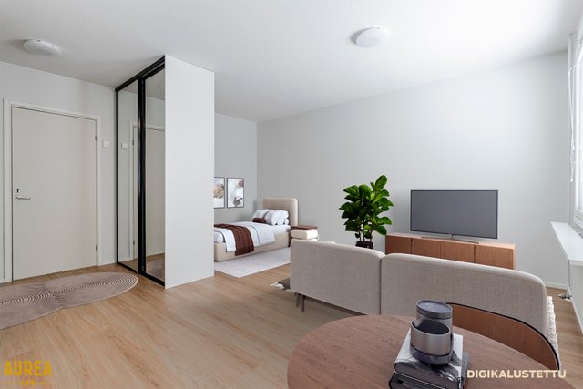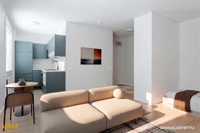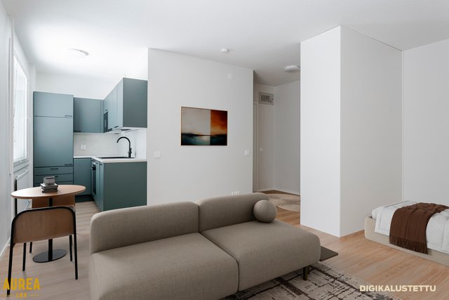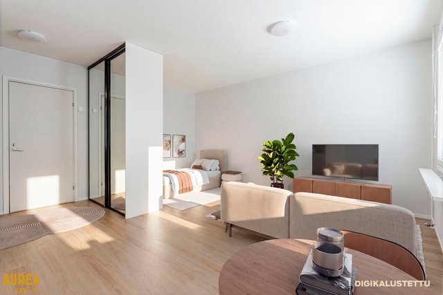 Kodin keskiössä on tilava olohuone, jossa sängylle alkovi. Tyylikäs INNO-keittiö, jossa hyvin lasku- ja säilytystilaa sekä tarvittavat kodinkoneet. Laatoitetussa kylpyhuoneessa tila pyykinpesukoneelle.