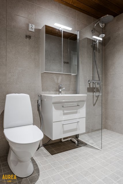 - Suihku, suihkuseinä, bidee-suihku, pesuallas, allaskaappi, peilikaappi, wc-istuin, lattialämmitys, ja pesukoneliitäntä