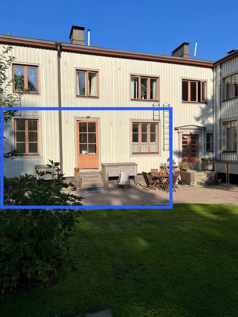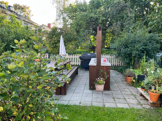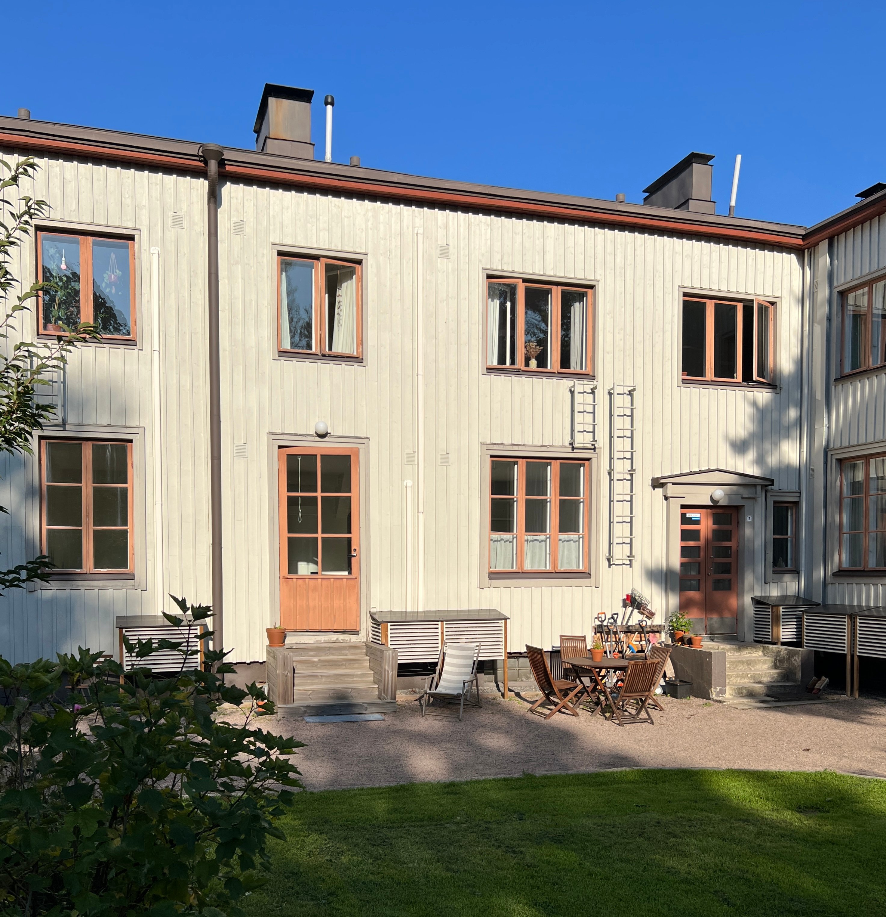 Upea puutaloasunto Kumpulassa, keittiöstä pääsy viihtyisälle piha-alueelle