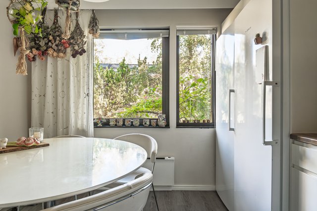 - Vaaleasävyinen tilava keittiö, pitkät jää- ja pakastinkaapit, ikkunan edessä reilusti tilaa ruokapöydälle