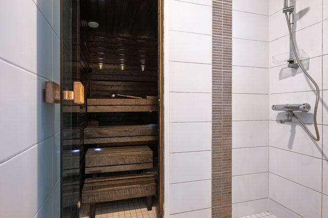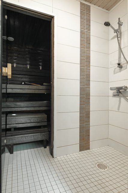 - Kylpyhuone- ja saunayhdistelmä suihkuseinällä