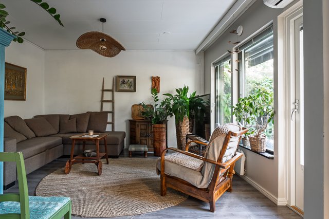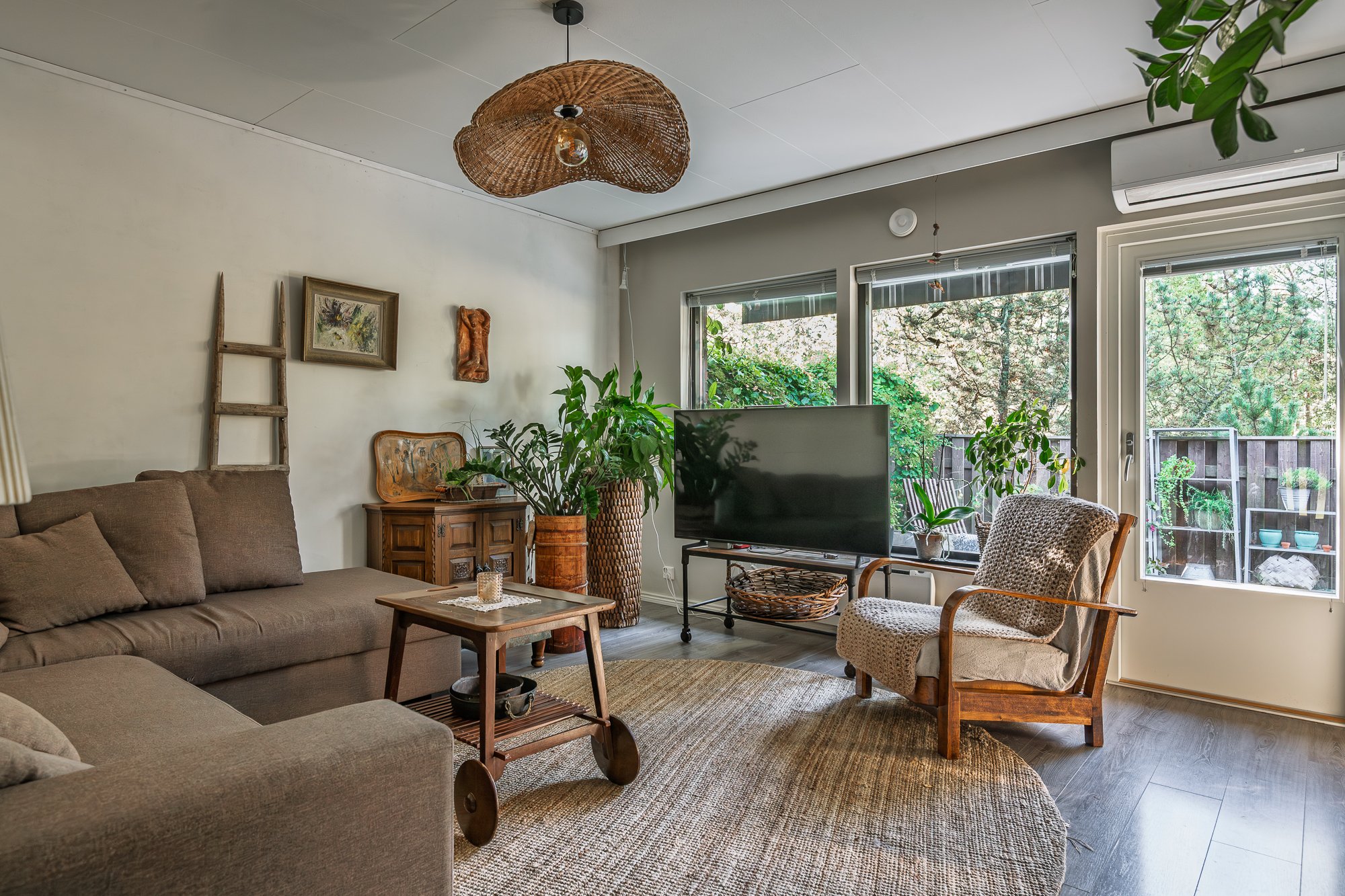 - Valoisa olohuone kauniilla näkymällä asunnon terassille