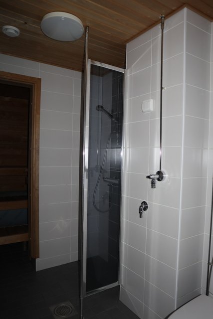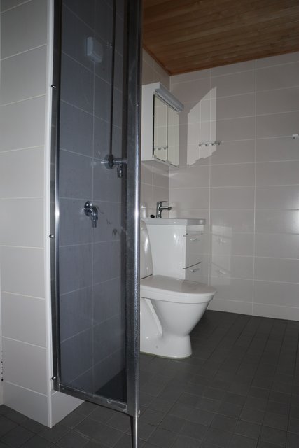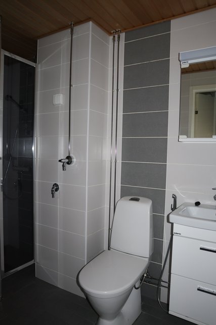- WC-istuin, suihku, pesukoneliitäntä, lattialämmitys, ja suihkuseinä