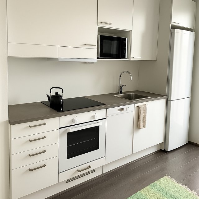 - Jääkaappipakastin, uuni, liesi, astianpesukone, ja liesikupu