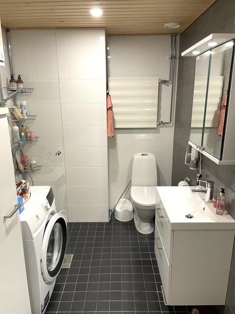 - Lattialämmitys, pesukoneliitäntä, wc-istuin, suihkuseinä, bidee-suihku, pesuallas, allaskaappi, peilikaappi, ja suihku