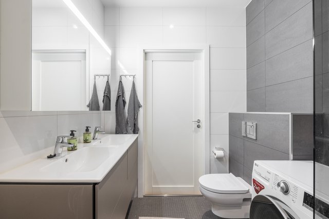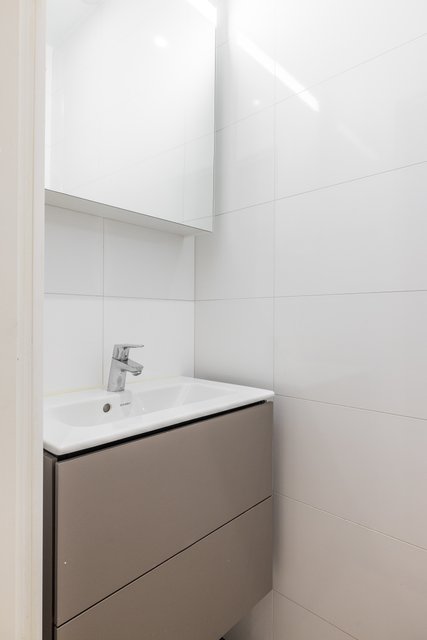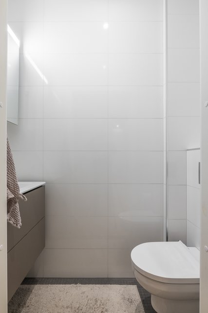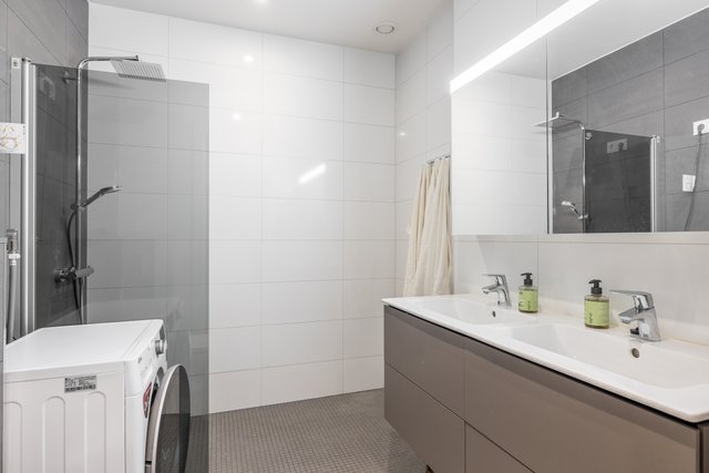 - WC-istuin, suihku, pesukoneliitäntä, lattialämmitys, peilikaappi, pesuallas, allaskaappi, ja suihkuseinä