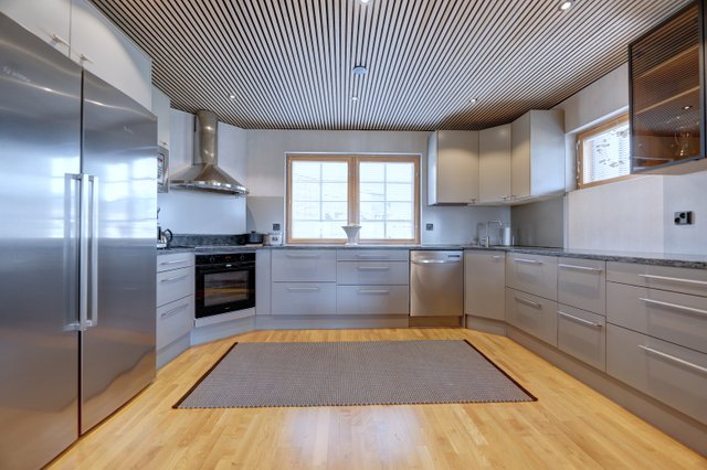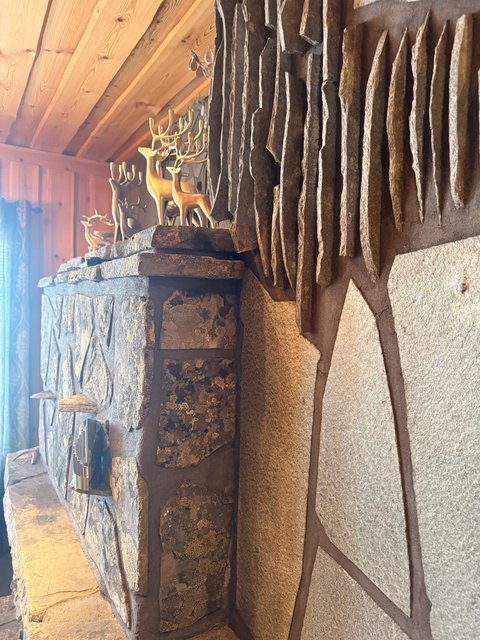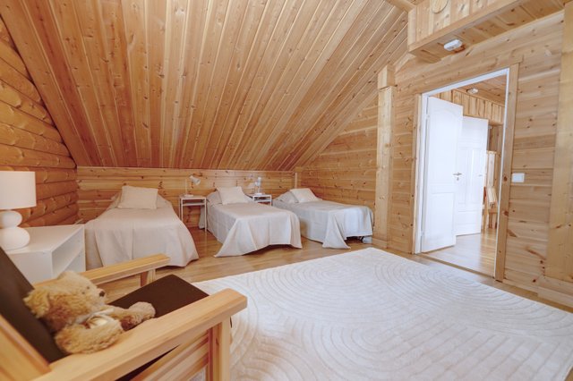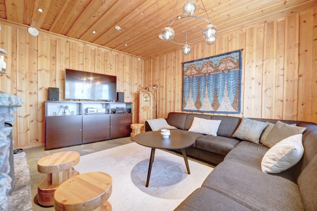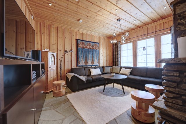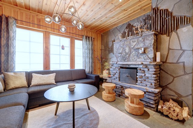 The villa has three floors. The basement has one bedroom, a utility room, a ski maintenance room, spacious washing facilities, a sauna, and the jewel in the crown: a truly magnificent fireplace room.