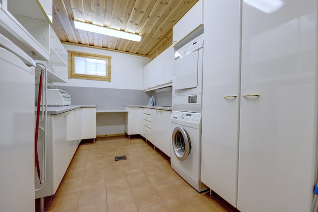 - Tilava kodinhoitohuone alakerrassa. Mankeli, kuivausrumpu, pyykinpesukone.