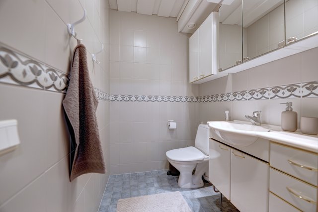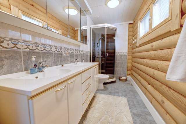 - Kellarikerros: Kph/saunaosasto. Keskikerros: 1 makuuhuoneen yhteydessä kph/wc, yläkerta kph/wc.