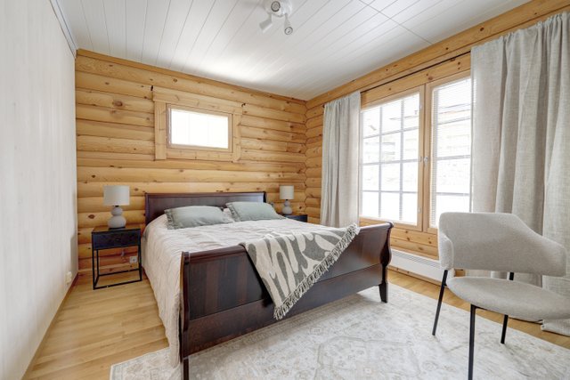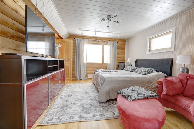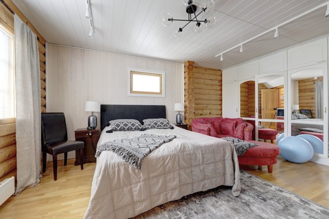 On the main floor, there are two spacious bedrooms, one of which has its own shower/toilet, and a spacious kitchen-living room with an eye-catching dining set that is included in the sale.