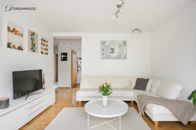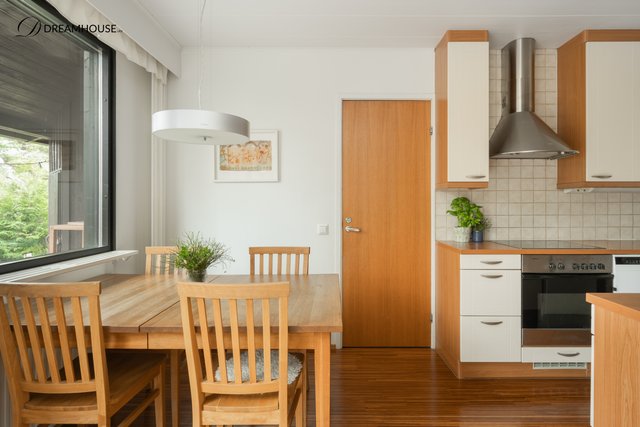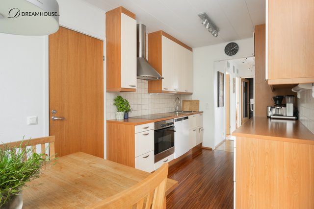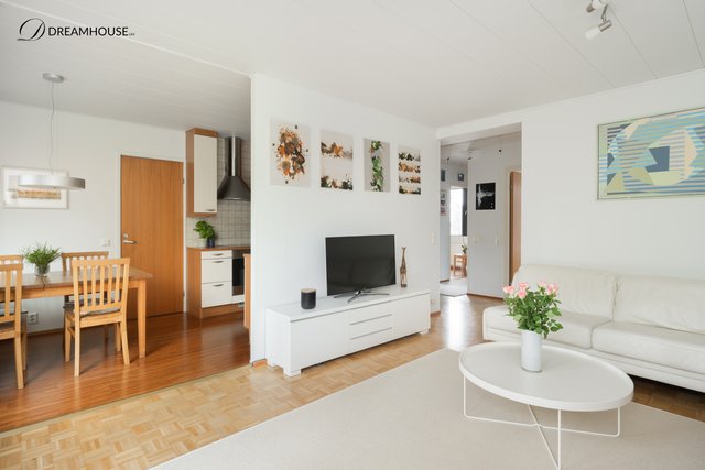 Valoisa olohuone ja sen yhteydessä oleva toimiva keittiö tarjoavat hyvät oleskelu- ja ruoanlaittotilat. Olohuoneen isot ikkunat tuovat luonnonvalon kauniisti sisään. Keittiössä on hyvin säilytys- ja työskentelytilaa.
