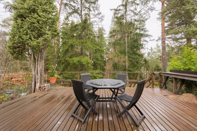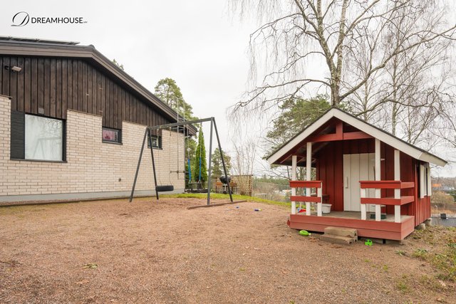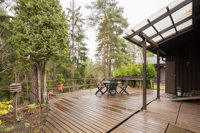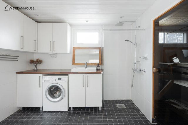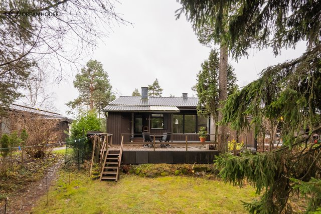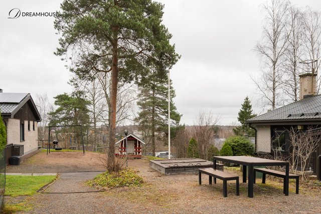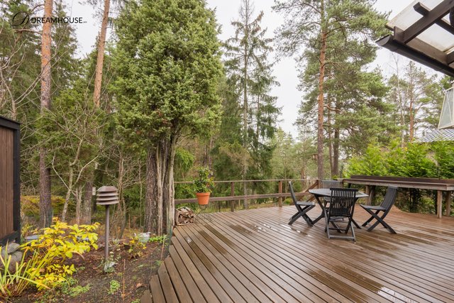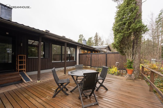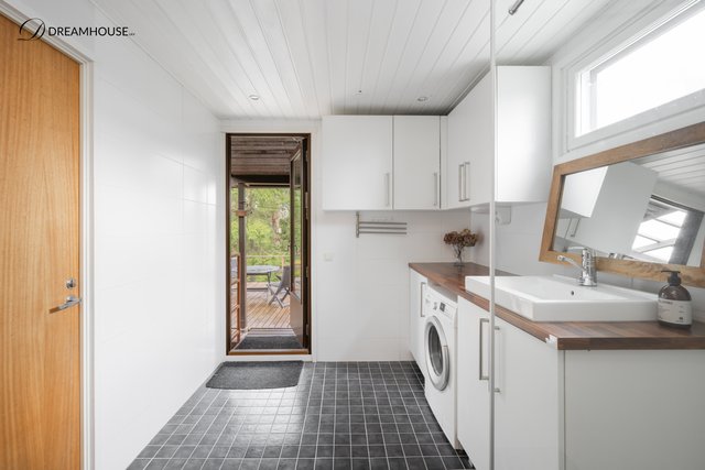 Olohuoneen- ja keittiön viereinen tilava kylpyhuone kodinhoitotilan kanssa mahdollistaaja sujuvan ja siistin ulos- ja sisäänkäynnin omalle suojaisalle pihalle. Piha toimii täydellisenä lepopaikkana kesäpäivien rentoutumiseen ja grillaamiseen. Ruokailun lisäksi pihalle mahtuu muitakin toimintoja, mm. lasten leikkipaikka. Kylpyhuoneen yhteydessä olevasta saunasta pääsee myös vaivattomasti vilvoittelemaan omalle terassipihalle. Metsään rajoittuva tontti antaa hyvän suojan.