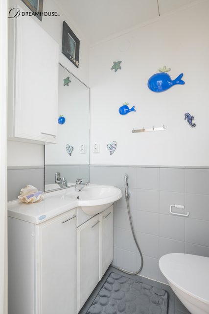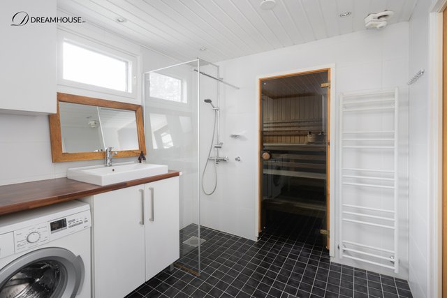 - Suihku, suihkuseinä, pesukoneliitäntä, lattialämmitys, pesuallas, peili, ja rättipatteri