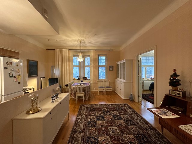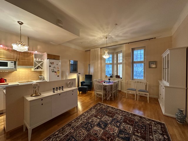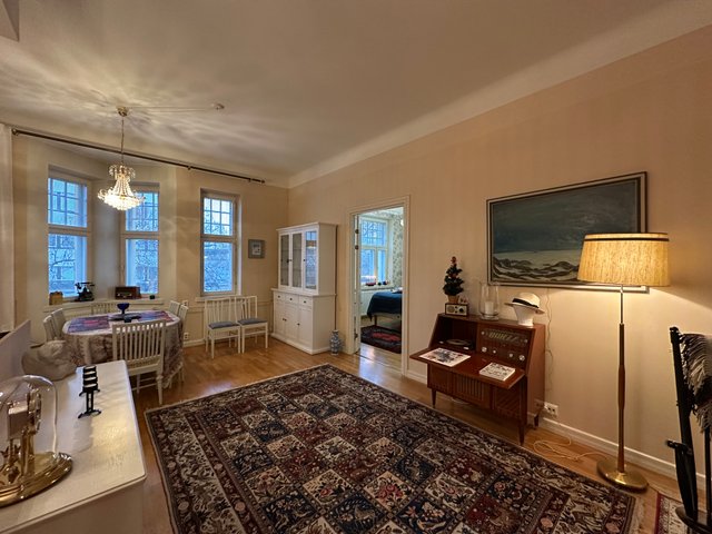 Asunto sijaitsee talon kolmannessa kerroksessa, ja sen yleiskunto on erinomainen. Avarat ja valoisat tilat, korkeat huoneet ja harmoninen materiaalivalinta luovat kokonaisuuden, jossa vanhan ajan arvokkuus ja moderni asumismukavuus nivoutuvat saumattomasti yhteen. Olohuoneen ja keittiön muodostama kokonaisuus on avara ja lämminhenkinen, ja parkettilattia tuo siihen elegantin viimeistelyn. Asunnossa on lisäksi oma sauna, joka tarjoaa arkeen rauhoittavan luksushetken. Asuntoo kuuluu lisäksi oma autopaikka.