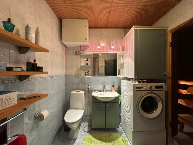 - WC-istuin, suihku, suihkuseinä, pesukone, peilikaappi, pesuallas, ja bidee-suihku