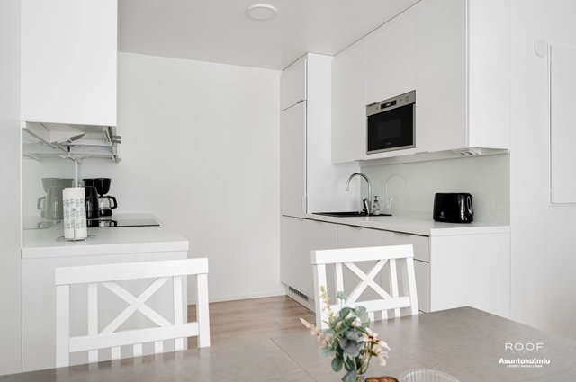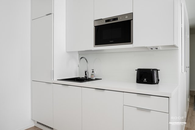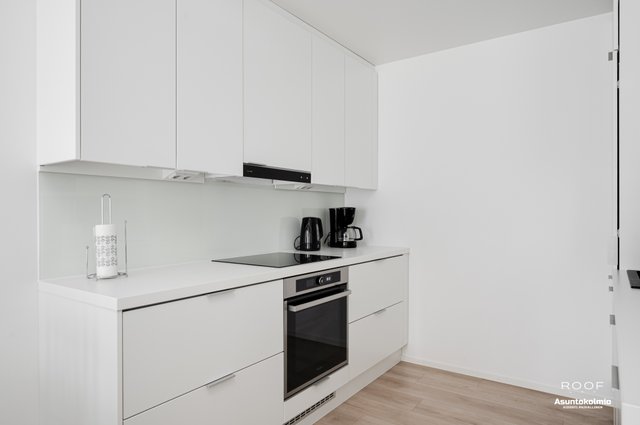 - Varustus: Jääkaappi/pakastin, induktioliesi, liesituuletin, integroitu mikroaaltouuni, uuni, astianpesukone. Työtasot laminaattia.