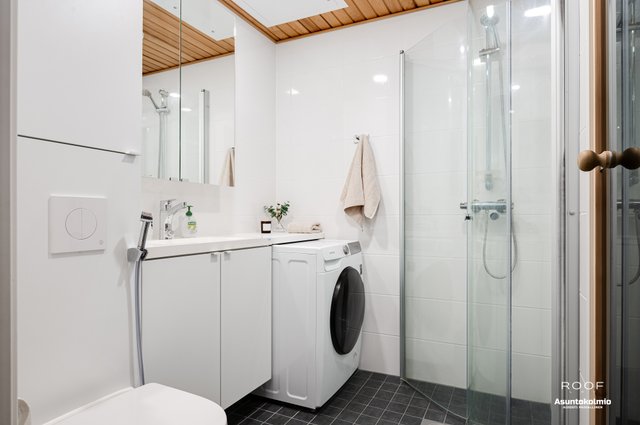 - Varustus: Lattialämmitys, pyykinpesukoneliitäntä, kaapistot, peilikaappi, suihku, suihkuseinät, wc-istuin.