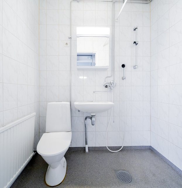 - Hyvä suihkutila. Wc-istuin ja pesuallas sekä peilikaappi. Lattiassa saumaton akryylibetoni, seinät laattaa.