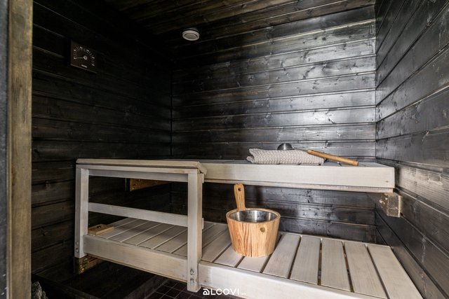 - Sähkökiuas. Lattia on laattaa, seinät ja katto paneloitu.