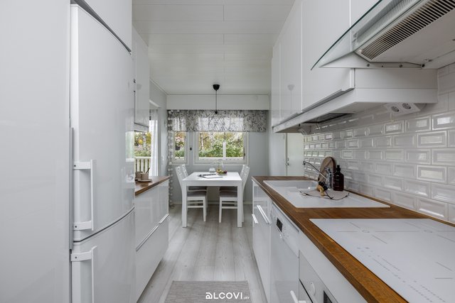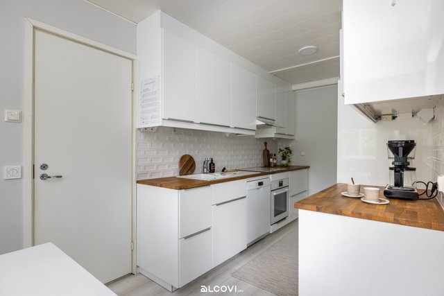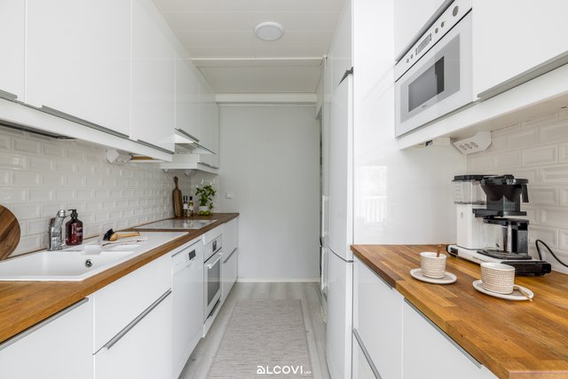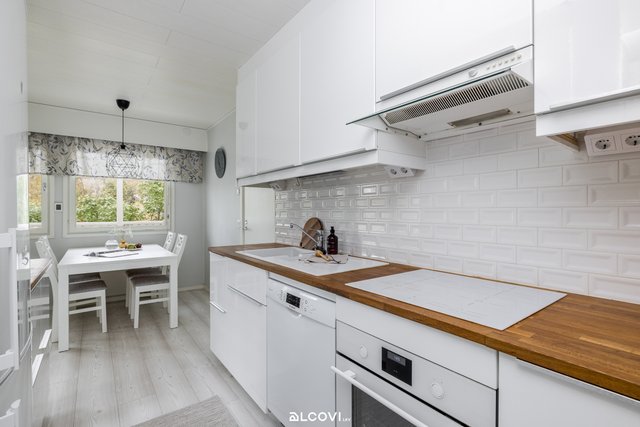 - Keittiö on remontoitu kokonaisuudessaan vuonna 2017. Varustukseen kuuluu jääkaappi-pakastin, mikroaaltouuni, induktioliesi, astianpesukone, liesituuletin (hormi), erillisuuni ja kiinteät led- valaisimet. Työtasot on puuta. Lattia on vinyyliä, seinät maalatut.