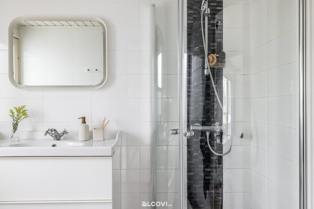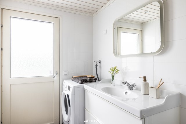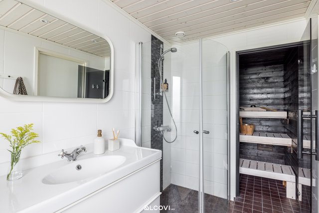 - Remontoitu vuonna 2016. Kylpyhuoneen varustukseen kuuluu suihkukaappi, pesukoneliitäntä, lattialämmitys (sähkö), peili ja kiinteät valaisimet. Lattiat on laattaa, seinät kaakeloitu ja katto paneloitu. Kulku suoraan ulos.