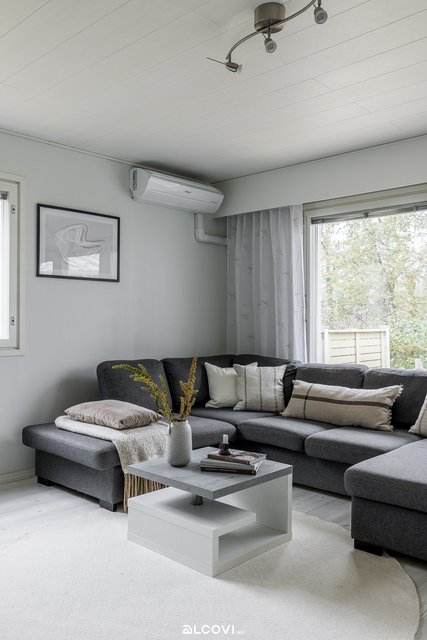 - Olohuoneen lattia on vinyyliä, seinät maalattu. Ilmalämpöpumpun sisäyksikkö. Kulku terassille.