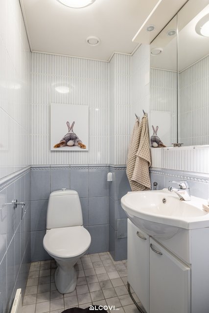 - Erillis-wc:n varustukseen kuuluu allaskaappi, peilikaappi, wc-istuin ja bidee-suihku. Lattia on laattaa, seinät kaakelia.