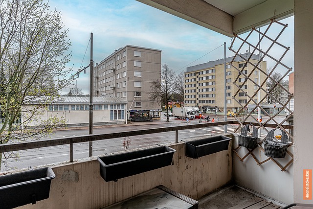 - Parvekkeelta näkymät Itäiselle Pitkäkadulle, taloja, keittiö ja makuuhuone pihanäkymin