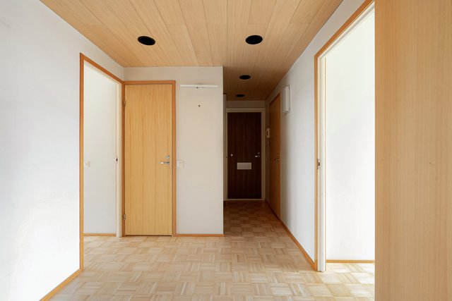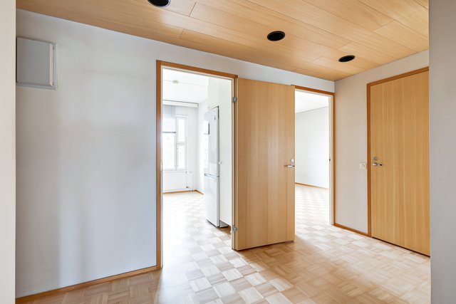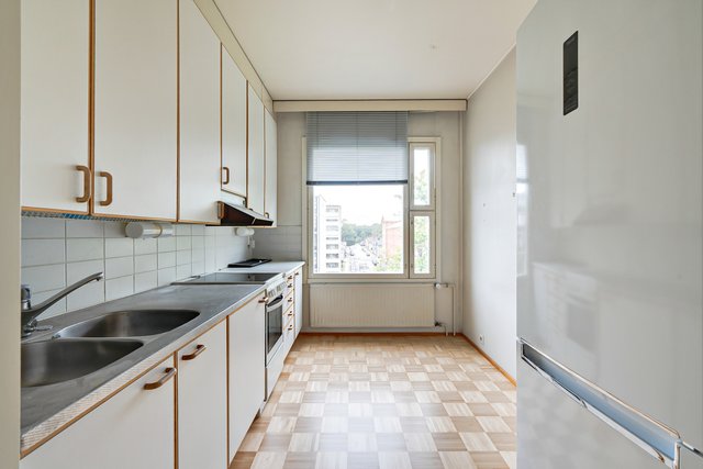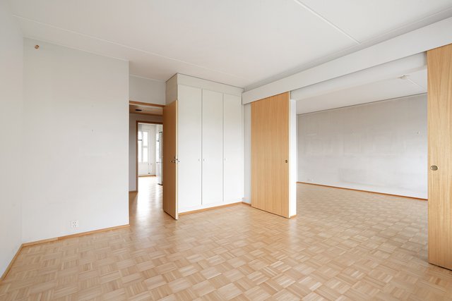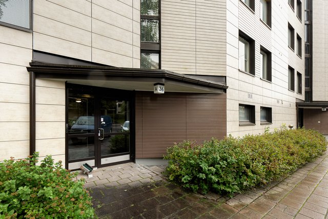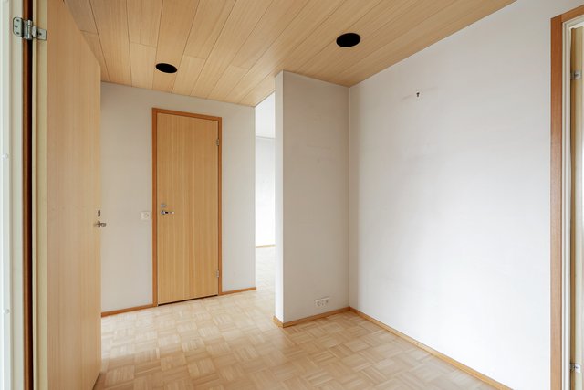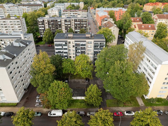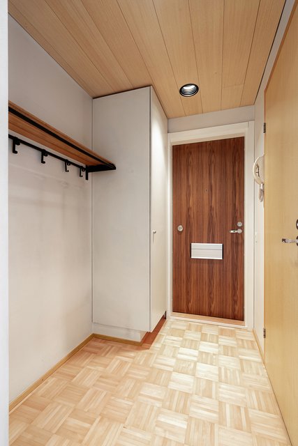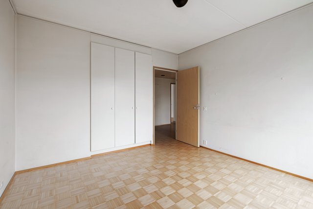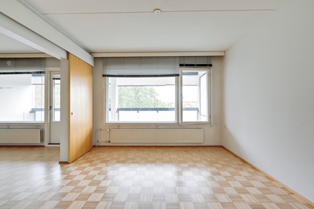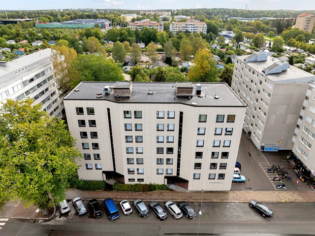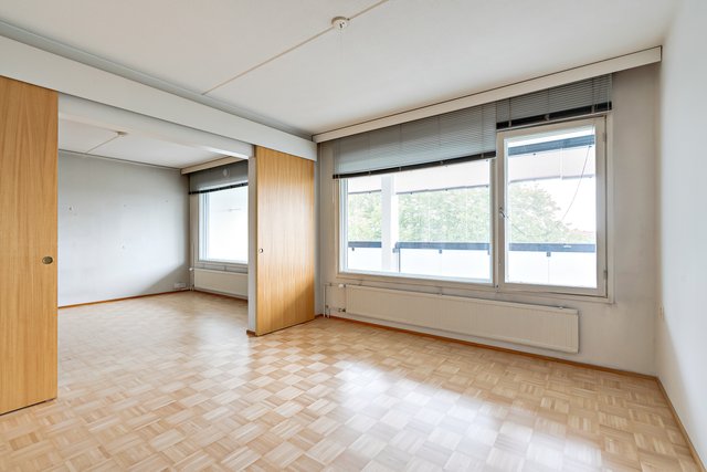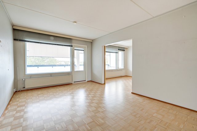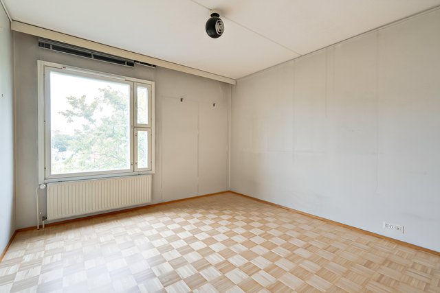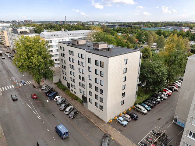 Läpitalon huoneisto, joka sijaitsee ylimmän kerroksen kulmassa. Olohuoneesta on kulku isokokoiselle, lasitetulle parvekkeelle. Erillinen keittiö, johon mahtuu pieni ruokapöytä. Kaksi makuuhuonetta, joista toinen on yhdistetty luontevasti olohuoneeseen tällä hetkellä. Kylpyhuone ja oma sauna. Erillinen wc. Vaatehuone.