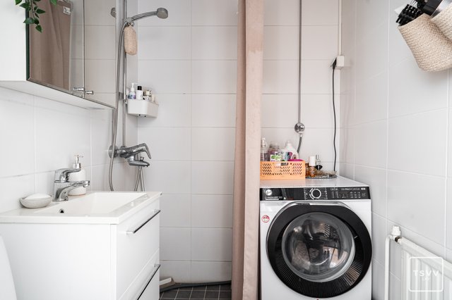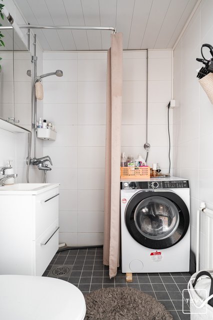 - WC-istuin, suihku, pesukoneliitäntä, lattialämmitys, peilikaappi, allaskaappi, ja bidee-suihku