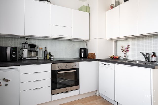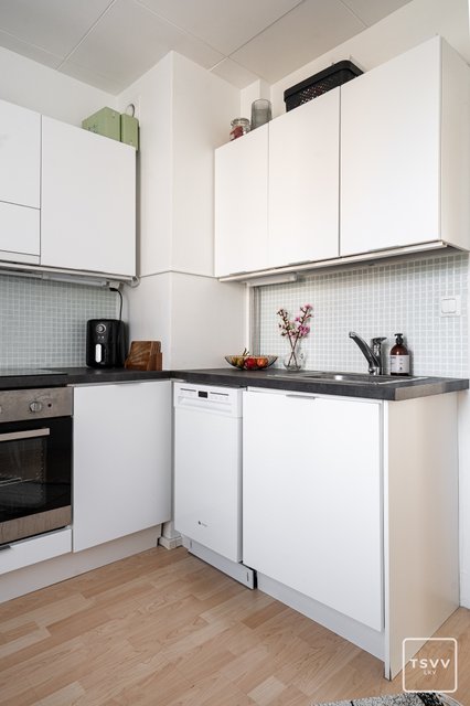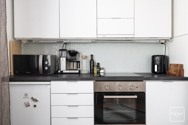 Asunnossa on moderni keittiö, jossa on kaikki tarvittavat varusteet, kuten astianpesukone ja keraaminen liesi. Kylpyhuoneessa on lattialämmitys ja pesukoneliitäntä. Laminaattilattiat ja maalatut seinät luovat raikkaan ilmeen, ja vaatehuone tarjoaa runsaasti säilytystilaa. Taloyhtiössä on myös sauna ja urheiluvälinevarasto.