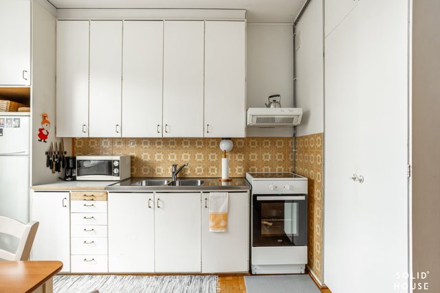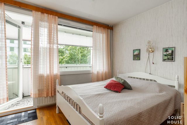 rantaa. Hyvin toteutetut asunnon neliöt, takaavat viihtyisän arjen. Olohuoneeseen mahtuu kaikki tarpeellinen ja lasitettu parveke tuo kesäisin mukavasti lisätilaa ja viihtyisän tunnelman. Keittiössä on kaikki tarvittavat varusteet arjen sujuvuuteen ja ruokapöytäkin mahtuu mukavasti. Makuuhuoneeseen mahtuu mukavasti parisänky ja yöpöydät. Vaatteille useampi kaappi.