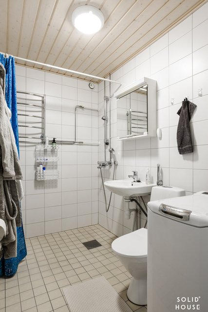 - WC-istuin, pesuallas, peilikaappi, suihku, ja pesukoneliitäntä