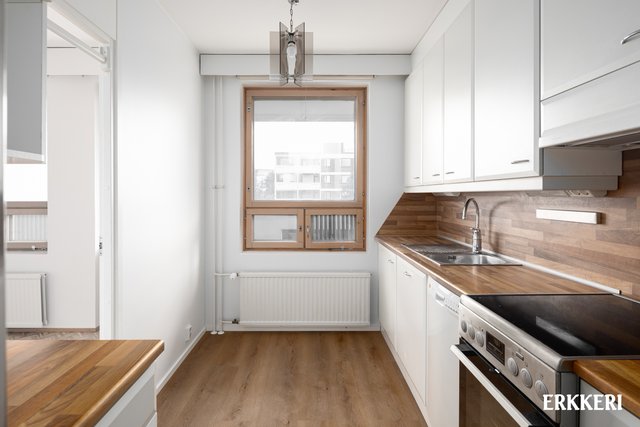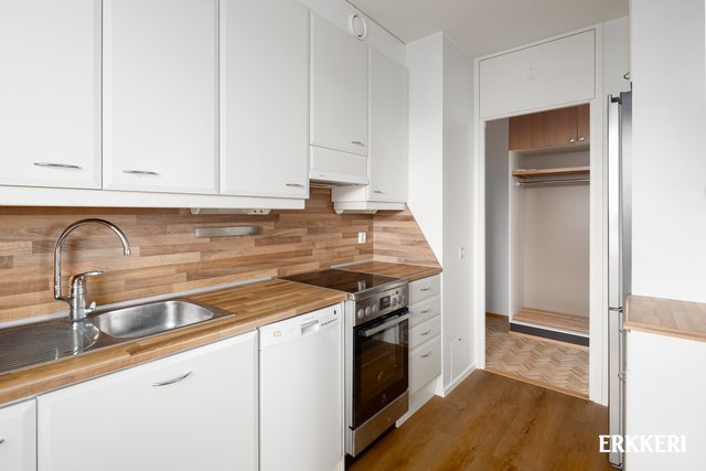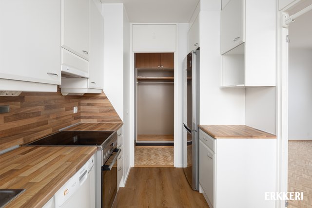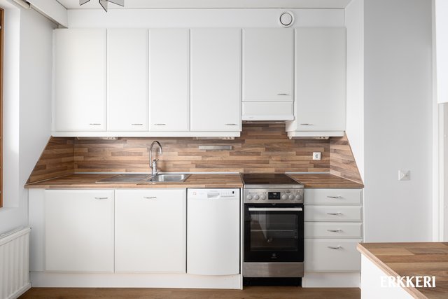 - Tyylikäs vaaleasävyinen kettiö, massiivipuutasot, runsaasti kaappi- ja laskutilaa.