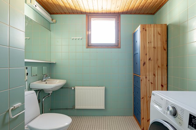 - Erillinen wc, jossa varusteluna pesukoneliitäntä, peili, käsienpesuallas, wc-istuin, bideesuihku. Seinät ja lattiat laatoitettu.
