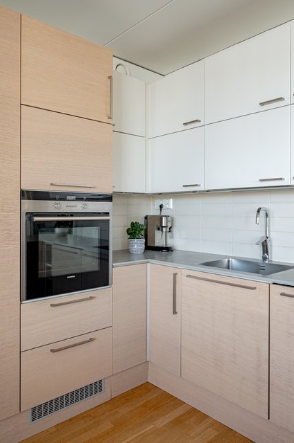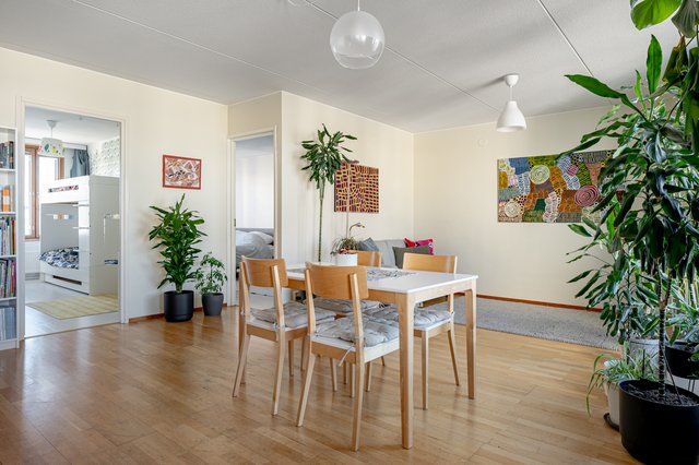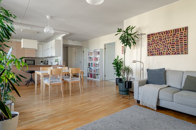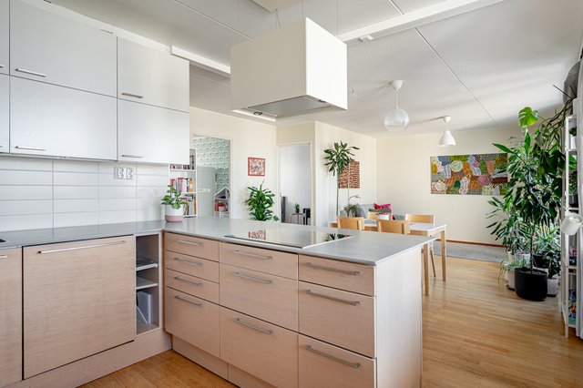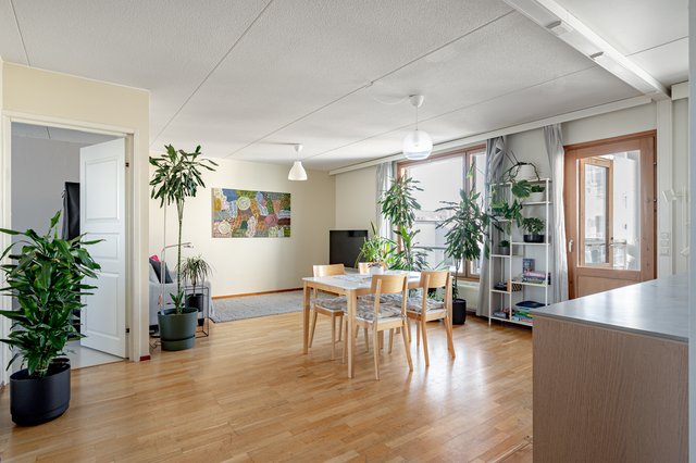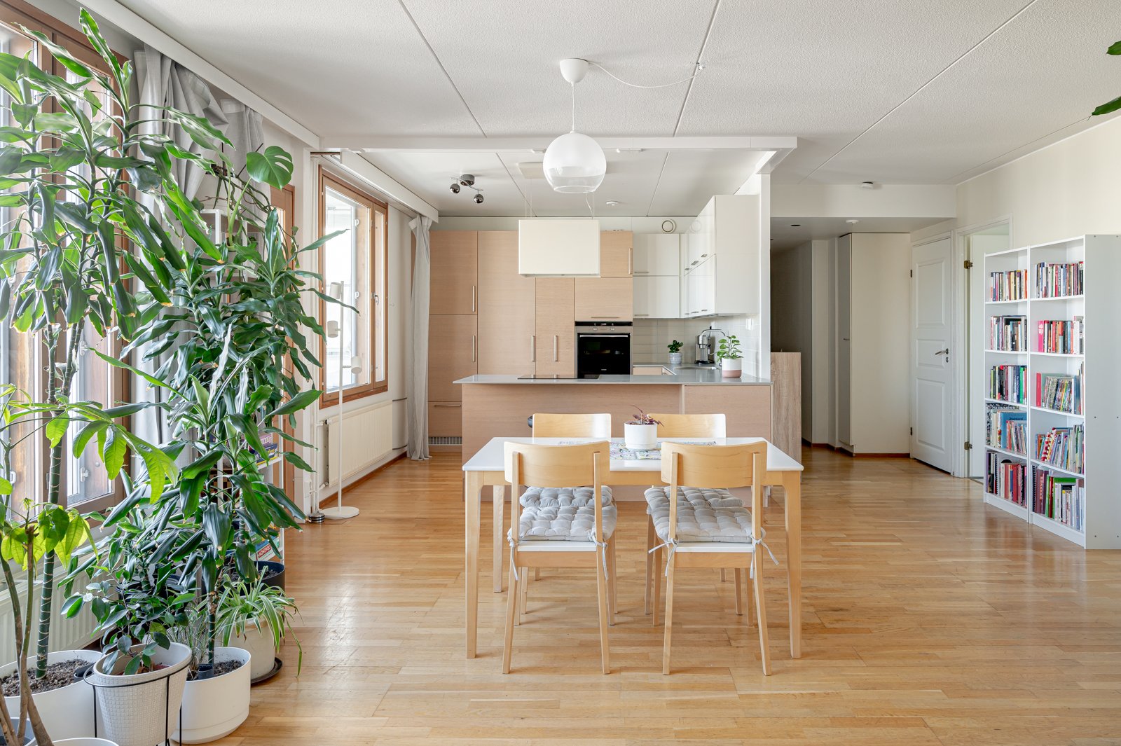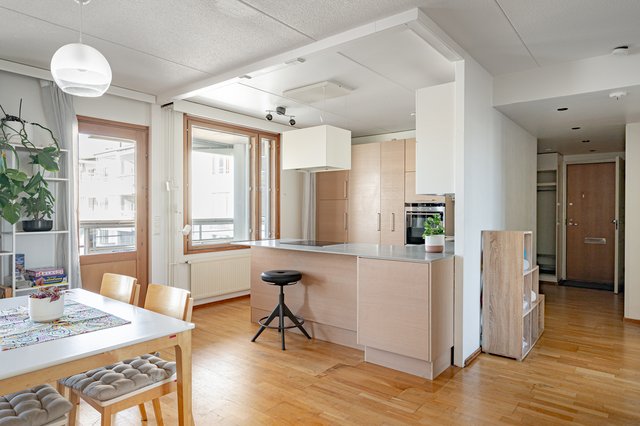 Nykyinen omistaja on viihtynyt kodissa pitkään, eikä ihme – toimiva pohjaratkaisu, rauhalliset näkymät ja hyvin hoidettu taloyhtiö tarjoavat puitteet mukavaan asumiseen. Keittiö on uudistettu reilu kymmenen vuotta sitten, jolloin se avattiin osaksi ruokailutilaa ja jaettiin tyylikkäällä saarekkeella. Puustellin ajaton keittiö kestää aikaa ja toimii erinomaisesti edelleen. Pohjaratkaisu toimii loistavasti pariskunnalle tai perheelle.
