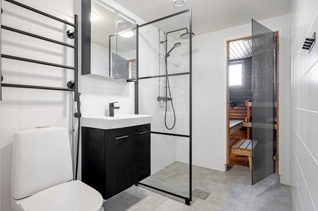 - Tyylikkäästi kauttaaltaan v. 2021 remontoitu kylpyhuone, jonka yhteydessä oma ikkunallinen sauna. Kylpyhuoneessa varusteluna suihkusetti; sadesuihku sekä käsisuihku, suihkuseinä, peilikaapisto, käsienpesuallas, allaskaapisto, wc-istuin, kuivauspatteri. Seinät ja lattia laatoitettu.