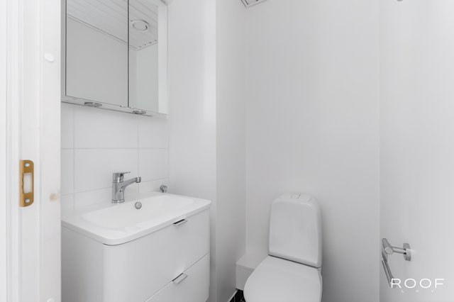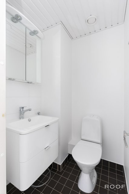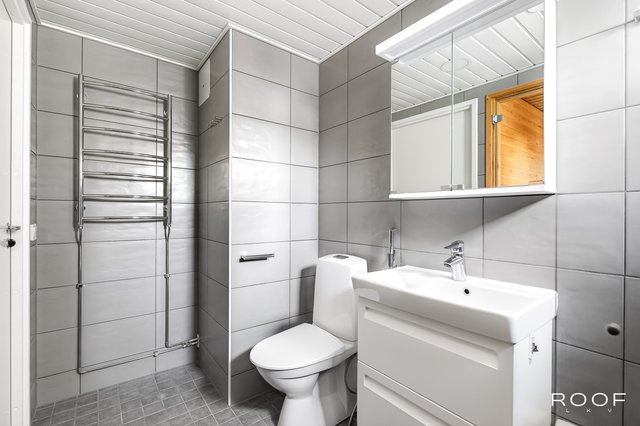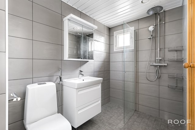 - WC-istuin, suihku, suihkuseinä, peilikaappi, pesuallas, allaskaappi, bidee-suihku, ja tuuletusikkuna, pyyhepatteri