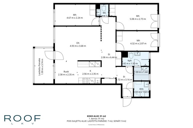 - Yhtiön huoneistojen pinta-aloja ei ole tarkistusmitattu, tämän vuoksi pinta-alat saattavat poiketa olennaisestikin nykystandardien mukaan laskettavasta huoneistoalasta. Huoneiston todellinen asuinpinta-ala voi siten olla yhtiöjärjestyksessä ja esitteessä ilmoitettua suurempi tai pienempi. Kohteen markkinoinnissa käytetään mittatiedoilla varustettua pohjapiirrosta. Pohjapiirroksen tarkoitus on helpottaa ostajan ostopäätöstä ja selvittää asunnon nykyinen huonejako. Ostaja on tietoinen, että pohjakuva on suuntaa antava, ei mittakaavassa, eikä perustu virallisiin piirustuksiin, Pohjapiirroksessa näkyvät mitat on luotu automaattisesti 3D-skannauksesta (leveys x pituus).