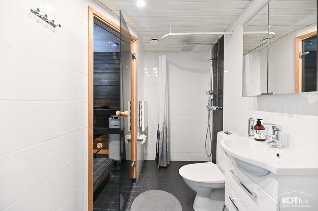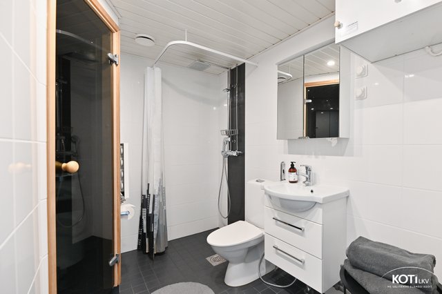 - WC-istuin, suihku, lattialämmitys, peilikaappi, pesuallas, allaskaappi, ja pesukoneliitäntä