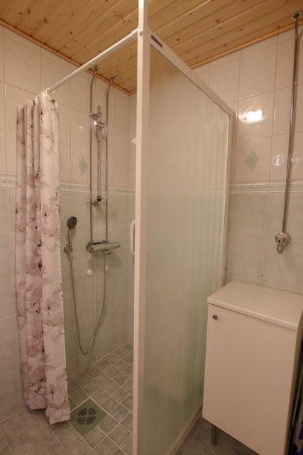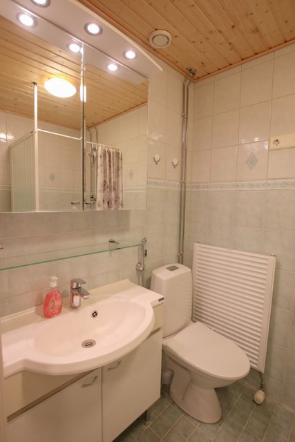 - WC-istuin, suihku, suihkuseinä, pesukoneliitäntä, peilikaappi, pesuallas, allaskaappi, ja bidee-suihku