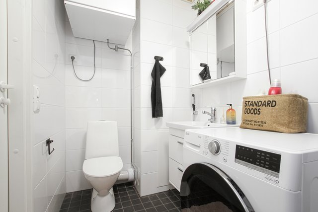 - WC-istuin, suihku, suihkuseinä, pesukoneliitäntä, lattialämmitys, peilikaappi, pesuallas, allaskaappi, ja bidee-suihku