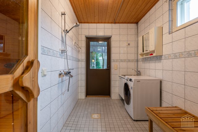 - Suihku, pesukoneliitäntä, lattialämmitys, peilikaappi, pesuallas, ja allaskaappi