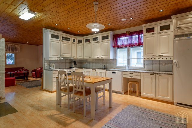 - Jääkaappi, erillinen pakastin, liesi, liesituuletin, astianpesukone, ja puuhella